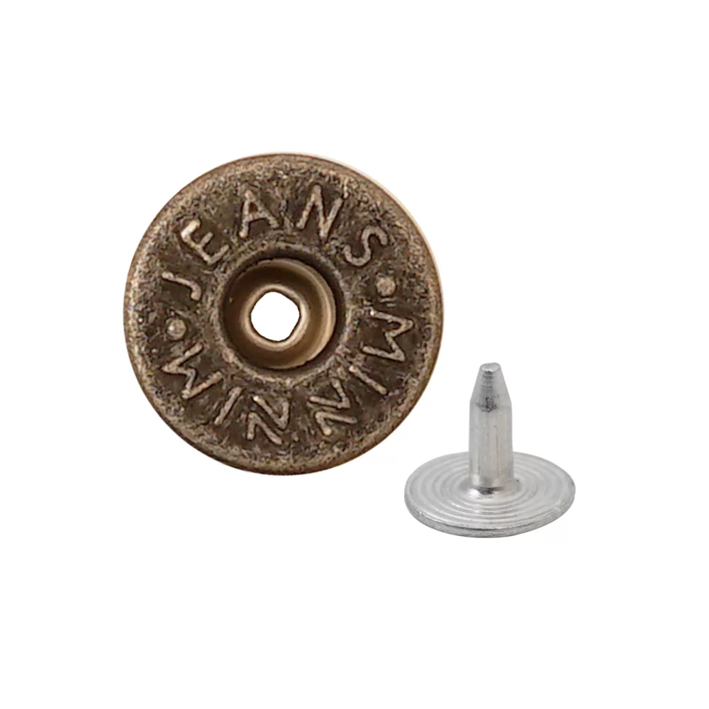A jean button with fixed leg is a metal button specially designed for denim and heavy fabrics. Unlike sew-on buttons, it is attached using a solid, non-movable leg (fixed shank) that is pressed or riveted into the fabric, ensuring high strength and long-lasting performance.