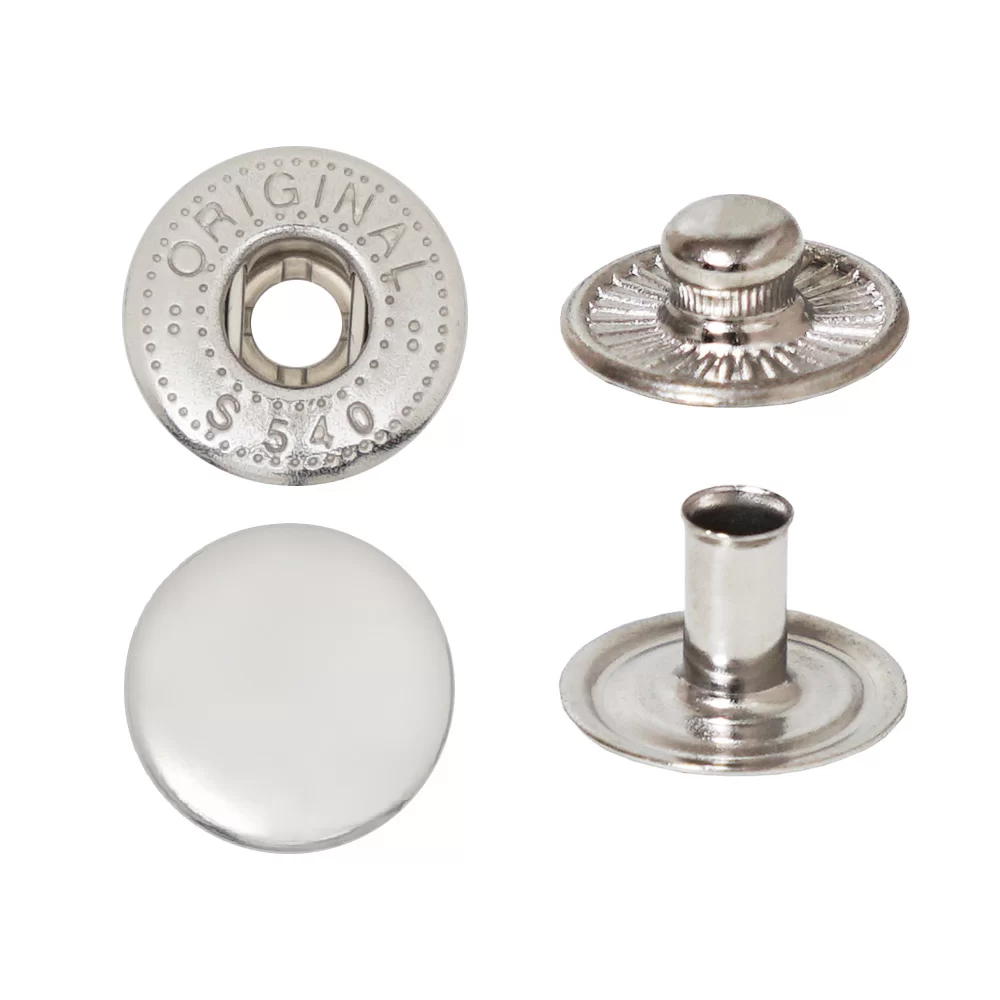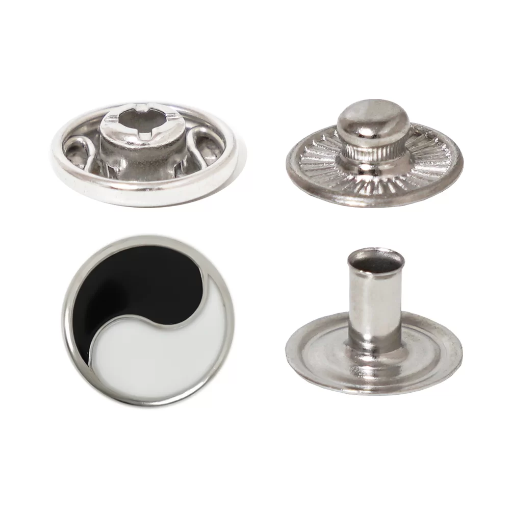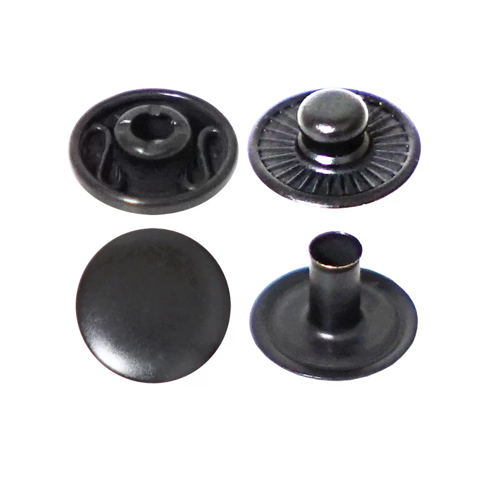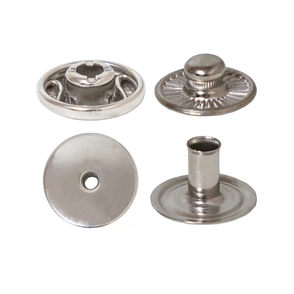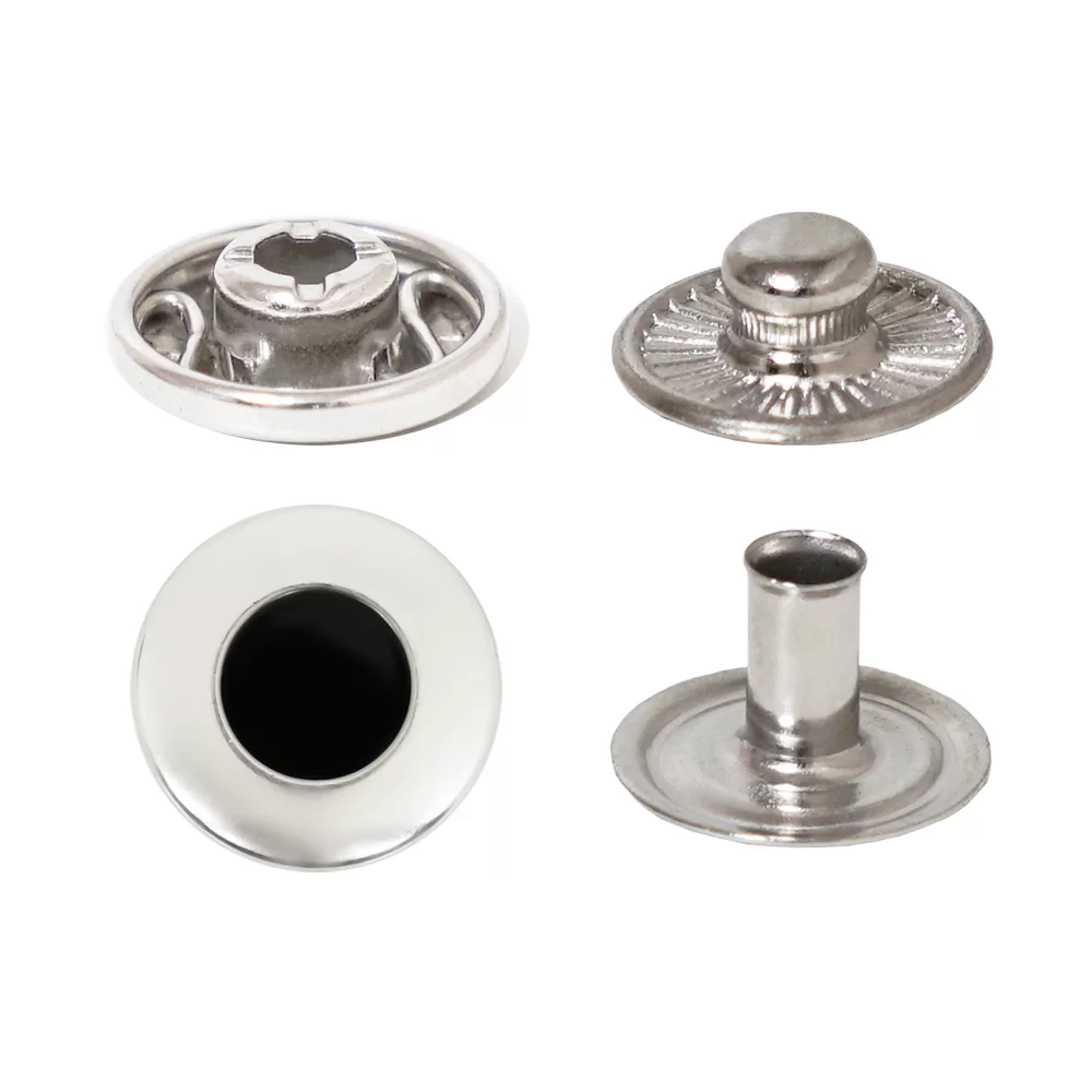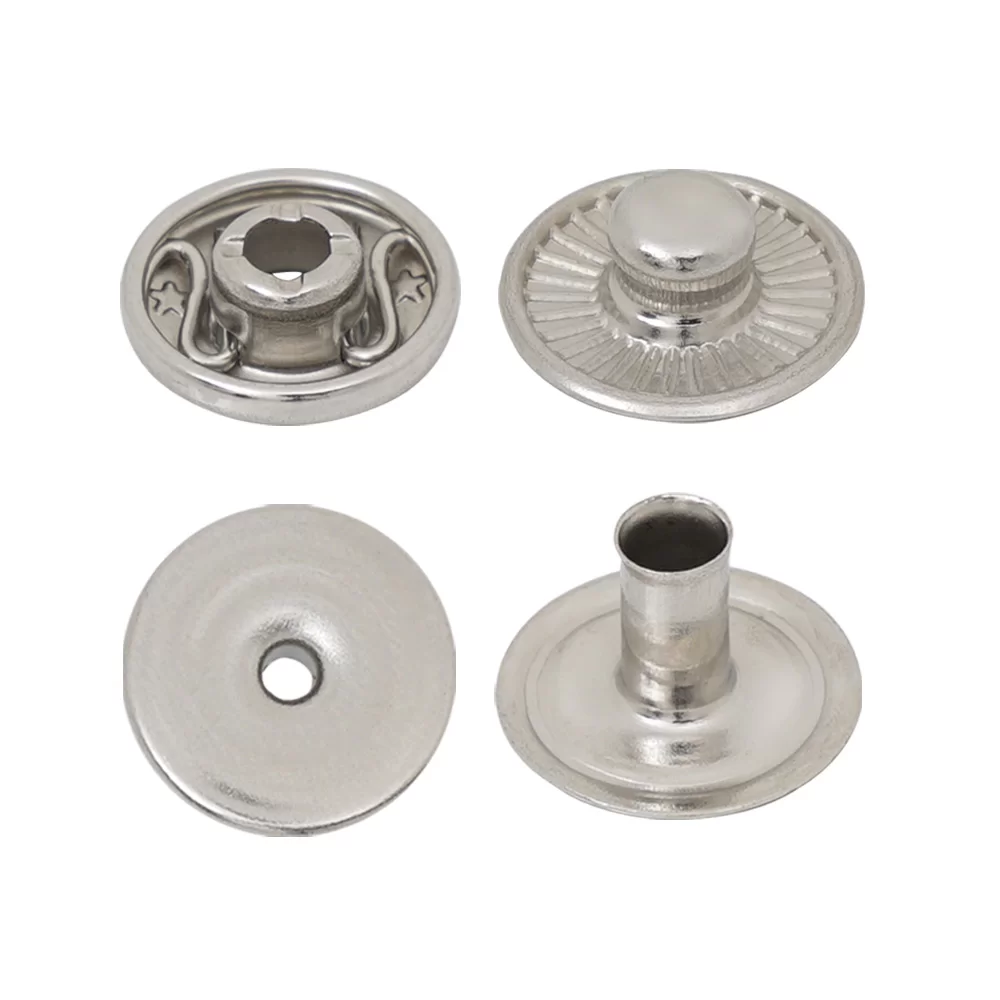 A spring snap button (also called a snap fastener or press stud) is a small fastening device that uses a built-in spring mechanism to securely join two pieces of material and allow easy opening when needed.